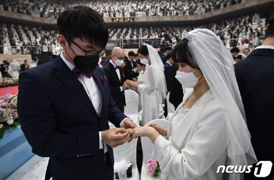 마스크 쓴 신랑신부 등장한 통일교 3만명 합동결혼식 머니투데이